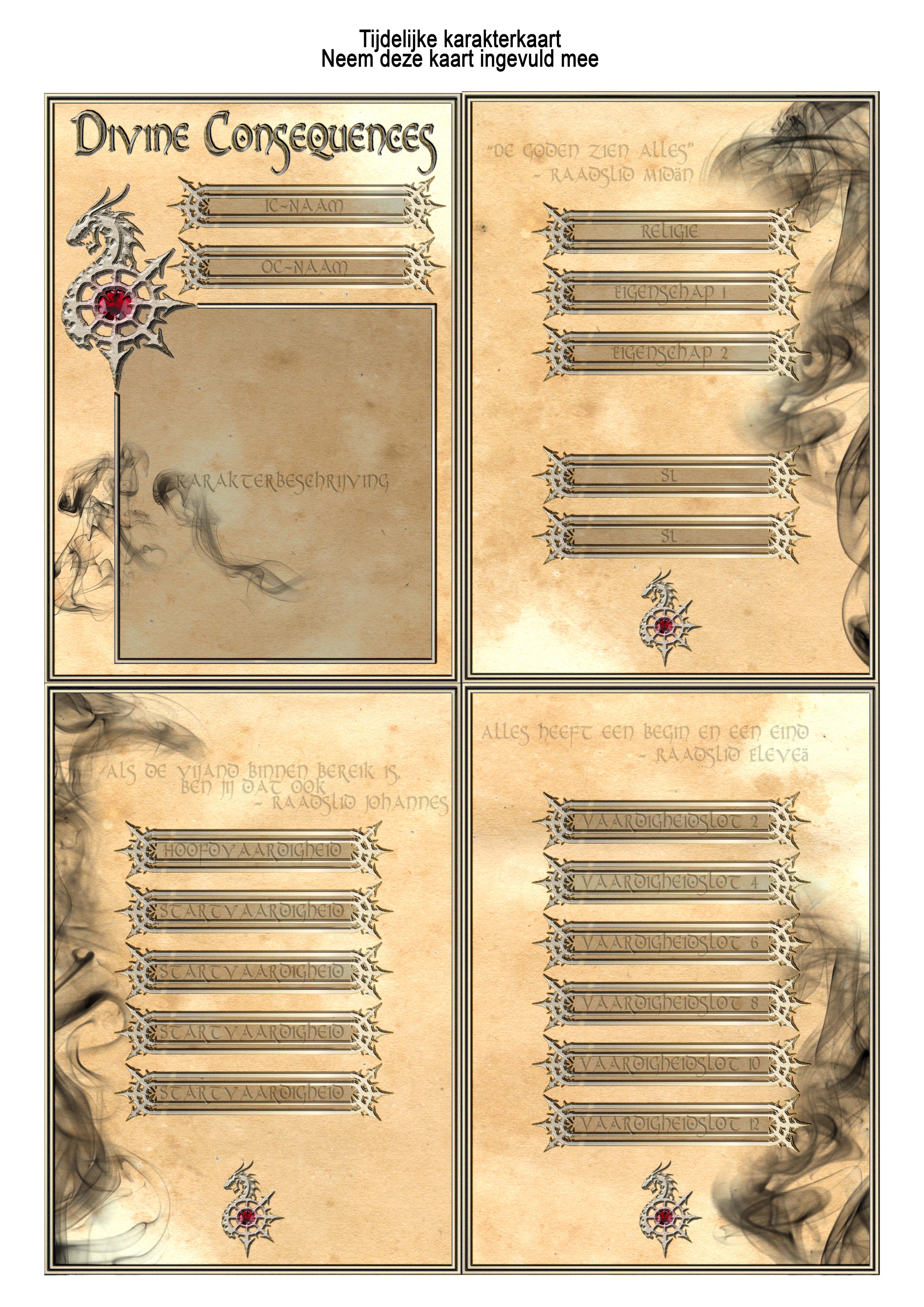 Welkom op de officiële site van Divine Consequences, het evenement waar al je acties gevolgen hebben. Hier vind je alles over de setting, de regels en de organisatie. Tickets zijn via deze pagina verkrijgbaar.